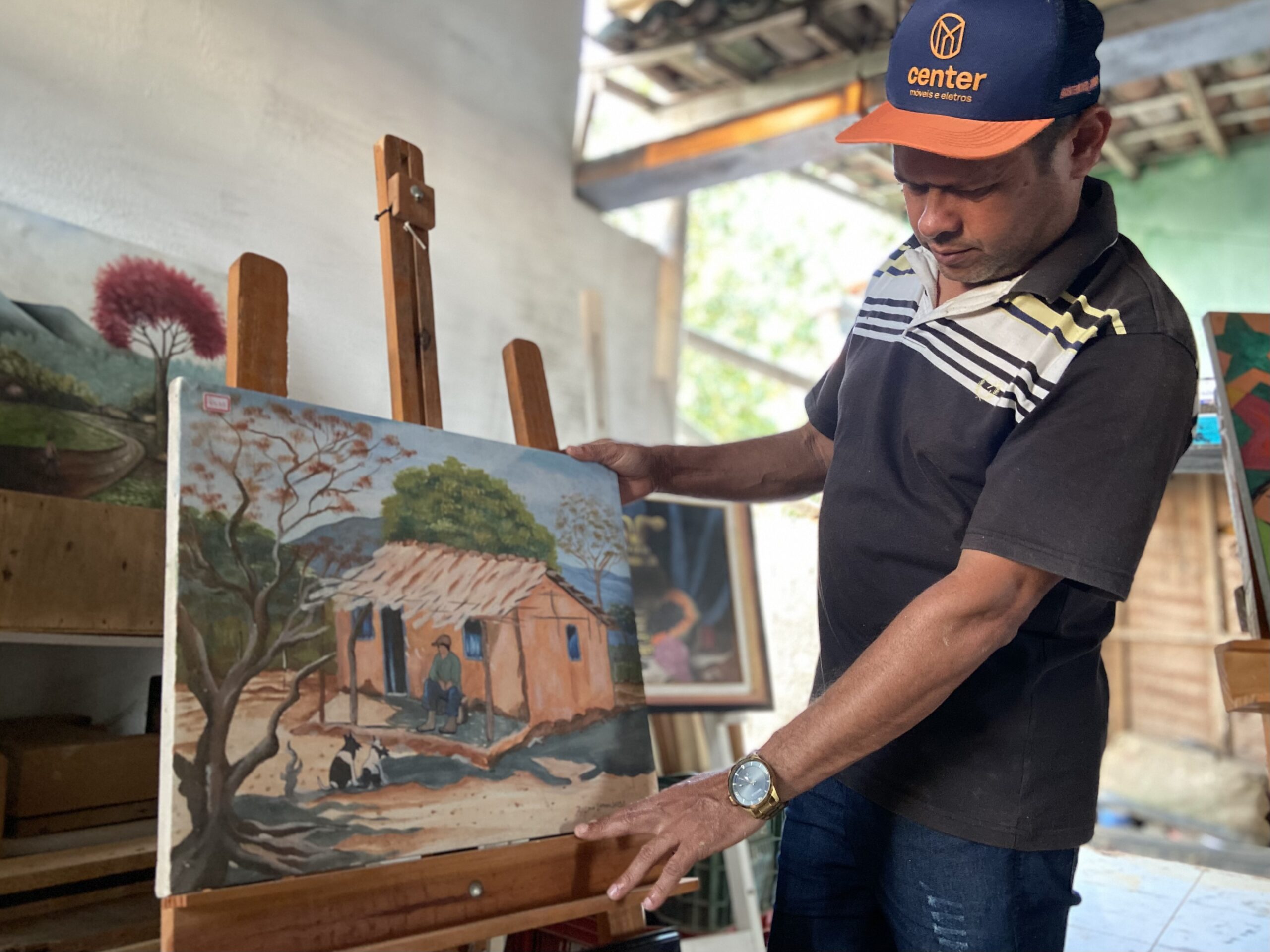 No modesto ateliê, um lugar quase sagrado, tudo carrega a delicadeza do seu trabalho manual. As molduras e cavaletes, produzidos na própria marcenaria, sustentam pinturas que retratam a simplicidade do homem do campo — paisagens rurais, carroças de burro e carros de boi, um varal de roupas ao sol, uma casinha no meio do mato ou uma mulher alimentando galinhas no quintal.