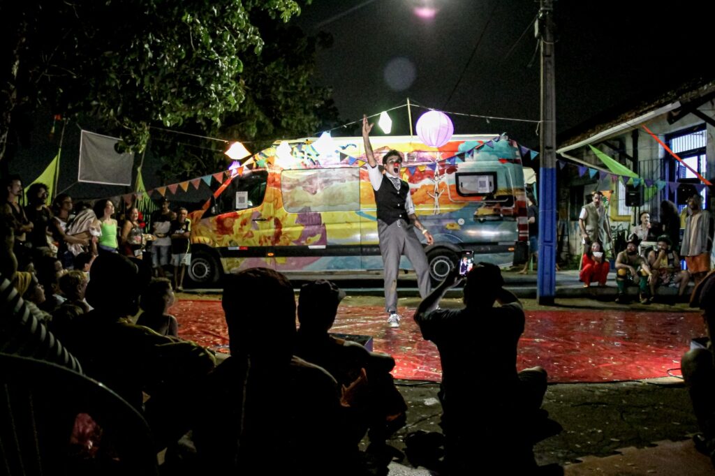 Aqui também comecei a entender os bastidores das artes, a aprender como sobreviver com essas habilidades muitas vezes desvalorizadas. Fiz muito malabares em farol, perna de pau em porta de loja, cuspi fogo em evento, executei trilha sonora de peça de teatro. Sempre observando as relações das pessoas, rindo do que ninguém mais via. Essas situações sempre aparecem em ensaios, ficam nas cenas. Por mais distinta da arte que seja a situação, a gente aproveita, representa, exagera. Muitas das cenas que o Coletivo já apresentou em festivais e eventos surgiram de intervenções de menos de um minuto, enquanto um farol não abria.