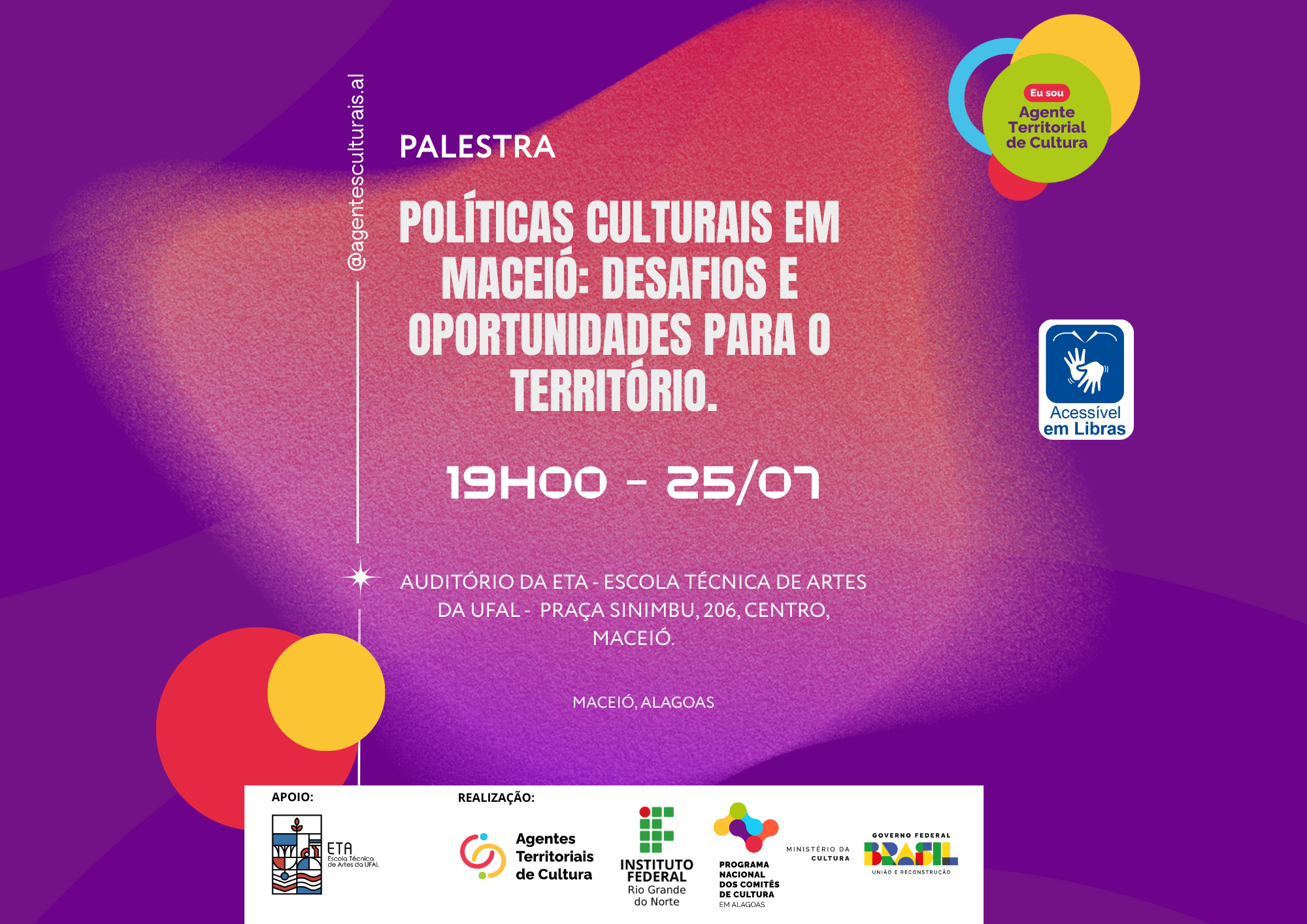 Para acompanhar as atualizações sobre o evento e conhecer os palestrantes confirmados, confira o perfil oficial @agentesculturais.al no Instagram.