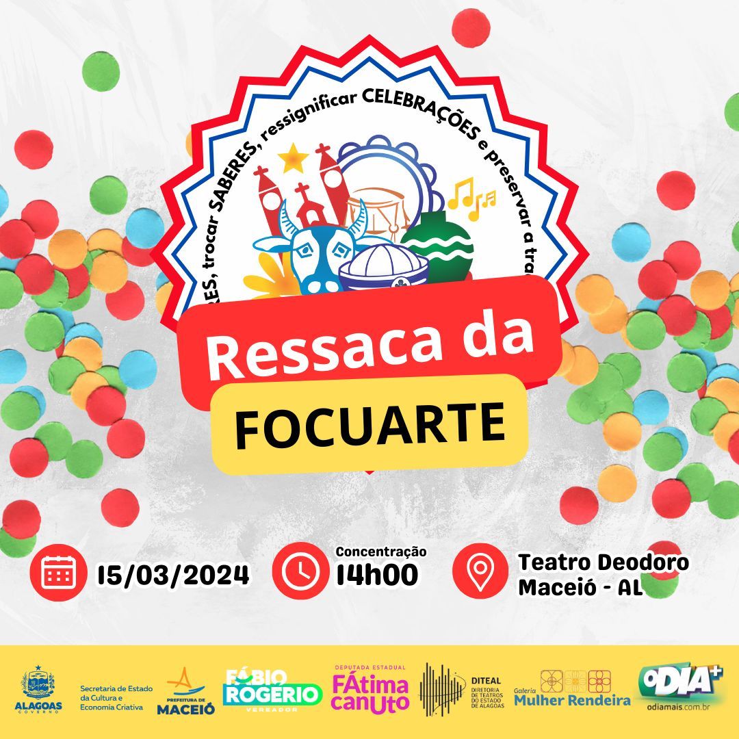 Já está virando tradição em Alagoas que a FOCUARTE encerre o ciclo carnavalesco com a sua agitada Ressaca que arrasta sempre na segunda quinzena de Março, mais de 500 foliões pelo Centro de Maceió. Esse ano a animação será dobrada para os foliões por conta da Banda da Polícia Militar e da CIA Passo Quebrado, que aguardam ansiosamente pela festa no próximo dia 15.